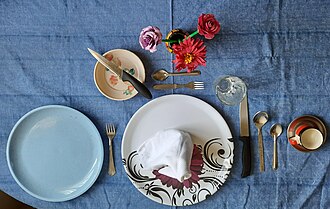 - Bread plates are to the left of the main plate, beverage glasses are to the right.