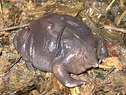 + | [[Image:Nasikabatrachus sahyadrensis.jpg|thumb|170px|left|Purple or pignose frog (''Nasikabatrachus sahyadrensis'')]] | ||