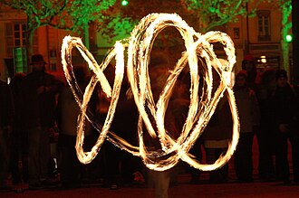 Fire performances can be interesting for both audience and performer, provided the poi spinner is good enough that they can control the fire poi without putting anyone (particularly themselves) at risk.