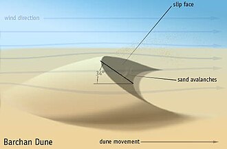 Barchans are the most mobile of all dune types, migrating many feet every year. They have what are called tips or horns pointing downwind and are wider than they are long.
