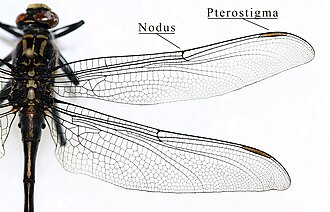 The pterostigma is a cell in the outer wing of insects which is often thickened or coloured and so stands out from other cells. It is particularly noticeable in dragonflies, but present also in other insect groups, such as snakeflies, hymenopterans and megalopterans. The purpose of the pterostigma, being a heavier section of the wing in comparison to nearby sections, is to assist in gliding. Without the pterostigma, self-exciting vibrations would set in on the wing after a certain critical speed, making gliding impossible. Tests show that with the pterostigma, the critical gliding speed is increased 10-25% on one species of dragonfly.