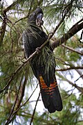 The Palm Cockatoo (Probosciger aterrimus) is distributed in rainforests and woodlands of New Guinea and northern Queensland, Australia. It measures around 55-60 cm in length and weighs between 500-1,000 g. It is a distinctive bird with a large crest and has one of the largest bills of any parrots (only the Hyacinth Macaw's is larger). The bill is unusual as the lower and upper mandibles do not meet for much of its length, allowing the tongue to hold a nut against the top mandible while the lower mandible works to open it.