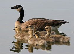 The black head and neck with white "chinstrap" distinguish this goose from all except the Barnacle Goose, but the latter has a black breast, and grey, rather than brownish, body plumage. There are seven subspecies of this bird, of varying sizes and plumage details, but all are recognizable as Canada Geese. Some are hard to distinguish from the Cackling Goose (Branta hutchinsii), with which the Canada Goose was long assumed to form one species; the name Lesser Canada Goose is, confusingly, often applied to B. hutchinsii. This species is 90-100 cm long with a 160-175 cm wing span. Males weigh 3.5–6.5 kg These birds feed mainly on plant material. When feeding in water, they submerge their heads and necks to reach aquatic plants, sometimes tipping forward like a dabbling duck. Flocks of these birds often feed on leftover cultivated grains in fields, especially during migration or in winter. During the second year of their lives, Canada Geese find themselves a mate. Most couples stay together all of their lives. If one is killed, the other may find a new mate. The female lays 4-8 eggs and both parents protect the nest while the eggs incubate, but the female spends more time at the nest than the male. During that time, they lose their flight feathers, so that they cannot fly until after their eggs hatch. This period lasts for 25-28 days. Adult geese are often seen leading their goslings in a line, usually with one parent at the front, and the other at the back of the "parade". While protecting their young, parents often violently chase away nearby creatures, from small blackbirds to other geese, to humans that approach, after warning them by giving off a hissing sound. The young do not leave their parents until after the spring migration, when they return to their birthplace. This well-known species is native to North America. It breeds in Canada and the northern United States in a variety of habitats. However, the nest is usually located in an elevated area near water, sometimes on a beaver lodge. The eggs are laid in a shallow depression lined with plant material and down. The Great Lakes region maintains a very large population of Canada Geese. Like most geese, the Canada goose is naturally migratory with the wintering range being most of the United States. The calls overhead from large groups of Canada Geese flying in V-shaped formation signal the transitions into spring and autumn. In some areas, migration routes have changed due to changes in habitat and food sources. In mild climates, such as the Pacific Northwest, due to a lack of former predators, some of the population has become non-migratory. | |