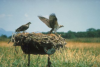 | + | [[Image:Ospreys Fern Ridge Reservoir Oregon.jpg|thumb|left|A pair of nesting ospreys in an artificial nest near Fern Lake Reservoir, Oregon]] | ||