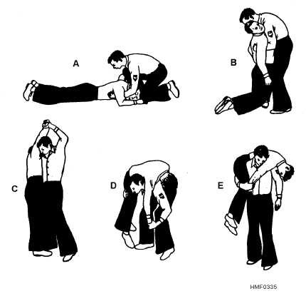 If there are no indications of injury to the spine or an extremity and the victim cannot walk, he can be carried by the Fireman’s Carry The figure here shows the steps of this procedure.