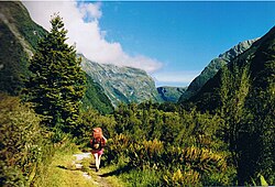 This picture of part of the Milford Track, photographed by me (sorry quality not the best as was taken prior to digital cameras and has been scaned), gives some idea of the contour lines on the Hollyford Map. These are glacier formed valleys u shaped with steep sides. The Milford, Routeburn and Holliford tracks are in the same area in Fiordland. Also pictured is a section of a topographic map. The complete map is produced by by the NZ Govt. This particular map is the old imperial series and has been superseeded by metric series 260. The picture of a map key is the same on any topographic map of a good scale. Hopefully both these map pictures will stay on this page as it is needed to demonstrate map understanding.