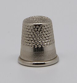 A thimble is a protective shield worn on the finger or thumb. It is used for pushing a needle through a piece of fabric in situations where the pressure applied to the needle would otherwise cause the needle to pierce the skin. A thimble is most usually made from metal, but can also be found made from leather, rubber, wood, glass or china.
