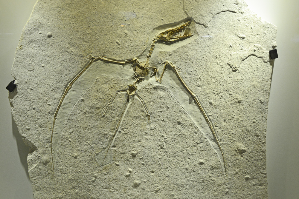 Rhamphorhynchus, on display at the Houston Museum of Natural Science. Rhamphorhynchus was a Pterosaur, a flying reptime (not a dinosaur) that most likely ate fish and insects. Complete fossils are found primarily in Solnhofen, Germany.