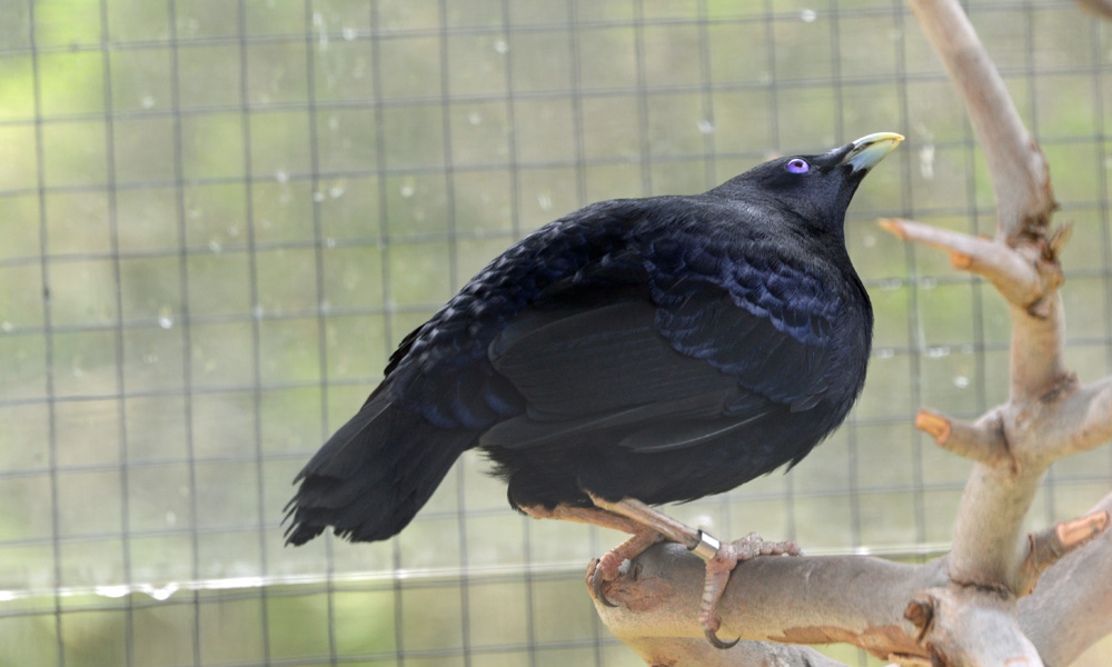 Male Satin Bowerbird (Ptilonorhynchus violaceus), captive, near Melbourne, Australia, December 2013.