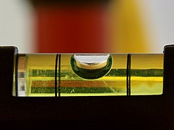 A spirit level or bubble level is an instrument designed to indicate whether a surface is level or plumb. Spirit levels feature a slightly curved glass tube which is incompletely filled with a liquid, usually colored 'spirit' (a synonym for ethanol), leaving a bubble in the tube. Ethanol is used because of its low freezing point, −114°C, which prevents it from freezing in cold weather. Most commonly spirit levels are employed to indicate how horizontal (level) or how vertical (plumb) a surface is.