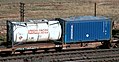 A Union Pacific Railroad 'tanktainer' aboard a flatcar.
