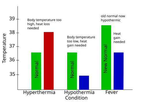 Fever: Characterized on the right: Normal body temperature is shown in green. It reads "New Normal" because the thermoregulatory set-point has risen. This has caused what was the normal body temperature (in blue) to be considered hypothermic.
