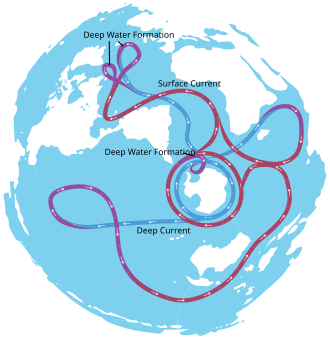 The current begins near the North Pole getting warmer as it travels south around South America eventually coming to Antarctica where it picks up cold water again. It then splits, one part traveling to the Indian Ocean and the other to the Pacific Ocean. As these currents reach the equator, they get warmer and eventually make their way back around South America and up in the North Atlantic Ocean where the cycle starts again. The water moves quite slowly at about 10 cm per second. It can take up to 1000 years for water in the North Atlantic to end up in the North Pacific!