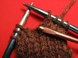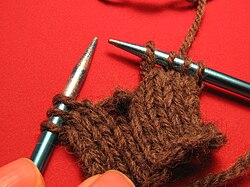 • Bar increase -- Knit the stitch normally but without transferring the knitted stitch to the right needle; the same stitch is then knitted through the back loop. (Knitting through the front loop again is not feasible, since it would undo the first stitch.) This increase makes a bar or a nub on the fabric.
