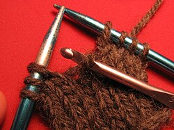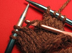 Finally, transfer the new loop (that is, the formerly dropped stitch) from the crochet hook to the knitting needle. In this photo, it was transferred to the right needle, but it should have been transferred to the left one instead.