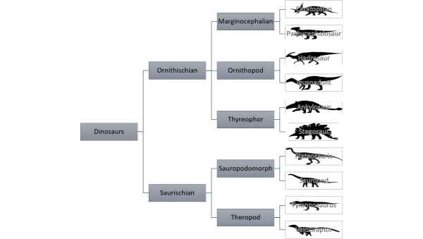 - Los dinosaurios se dividen generalmente en dos grupos, que se distinguen principalmente por las diferencias en la disposición de sus huesos pélvicos. Cada uno de estos grupos se subdividen en base a otras características comunes: