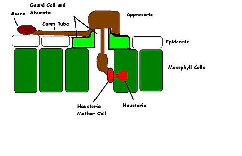 The stomata is the site of a structure called an appresorium that functions to both firmly anchor the fungus and aid in penetration. From the appresorium an infection peg grows down into the plant and between the leaf cells.