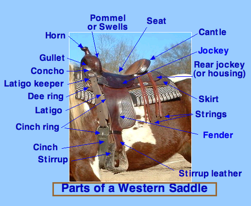 Label on an outline drawing or point out on a real saddle and bridle: Western— minimum of 10 parts of the saddle and 6 parts of the bridle; English—minimum of 9 parts of the saddle and 7 parts of the bridle.