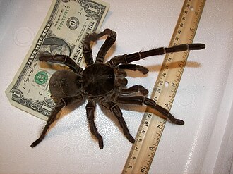 The goliath bird eating spider (also called the birdeater) (Theraphosa blondi) is an arachnid belonging to the tarantula family and is the largest spider in the world. The spider was named by explorers from the Victorian era, who witnessed one eating a hummingbird and reported the sighting to the Western world.