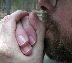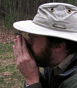 Hold the fingers of the right hand together and bring the tips into a tight circle. Place them in the web between your left thumb and index finger, enclosing the left hand about the right. The two thumbs should be parallel to one another and resting on the right index finger. This should form a cavity with a small gap opening into it between the upper and lower thumb knuckles. Bend the thumbs slightly and place your lower lip just below the top joint in the thumbs. Place the upper lip on the top joint and blow downwards into the cavity. If you're doing it right, it will make a whistling noise very similar to the call of mourning dove or a bob white. Try to keep the cavity air tight except where your breath enters between the thumbs. Once you are able to do this, try raising the pinky of your left hand while whistling. The pitch should rise. Quickly raising and lowering the pinky repeatedly will cause the whistle to quaver. Try not to drive anyone crazy with your new-found skill!