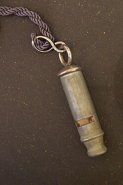 Whistles are used by referees to officiate sporting matches. The whistle was first used to stop a sports match by William Atack in an 1884 game of rugby in New Zealand. Before that game referees used their voices to control play.