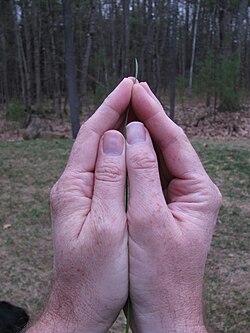 Select a long, wide blade of grass. Prepare to hold your hands together as if to pray, with the lower portion of the thumbs touching one another, palms together, and with the tips of the thumbs touching. Lay the grass blade between the lower thumbs as you press them together. The upper portion of the blade will lie parallel to the thumbs and be pinched together by the thumb tips. Before pinching the upper portion of the blade, bend the thumbs slightly. Then pinch the grass blade between the tips of the thumbs (or the index fingers), and extend the thumbs (or index finger), pulling the grass taut.
