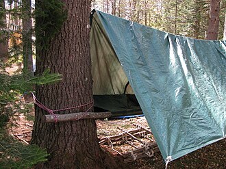 As a more comfortable alternative to using continuous lashing to attach cross bars, you can instead use a tarp as a platform. It is constructed the same way you would build an improvised litter (stretcher) as described in the Basic Rescue honor. If you have a tarp, you will also probably have enough to stretch it over the platform as well creating walls and a roof to keep the weather at bay.