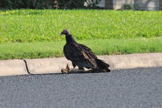 Turkey Vulture (Cathartes aura), feeding on a dead squirrel. Image taken in Austin, Texas, September 2009. Order Accipitriformes, Family Cathartidae [Image: R. Baker]