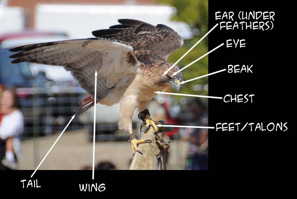 Basic external anatomy of a raptor (a red-tailed hawk, in this case). The ears are not visible, as they are behind the feathers.