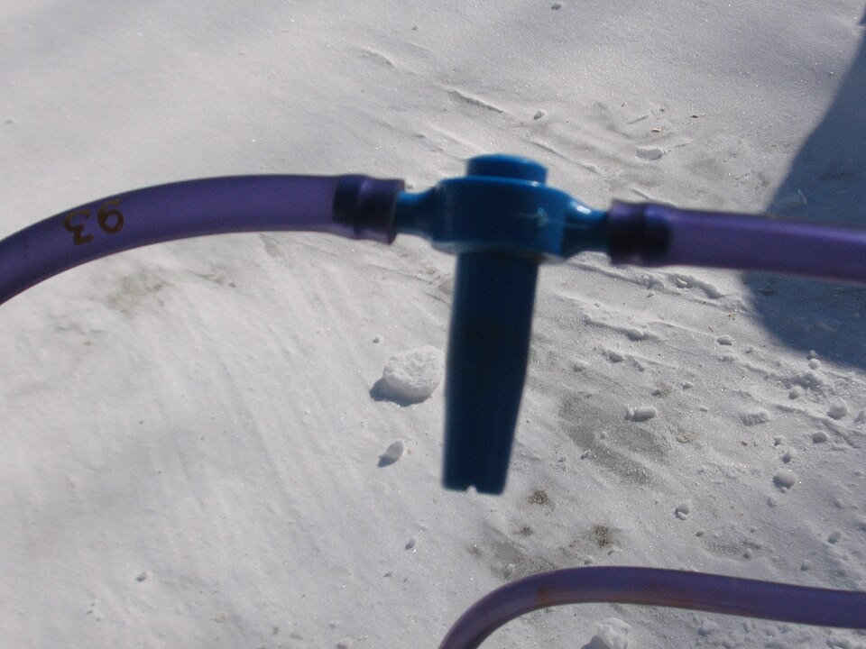 A tap designed for connection to plastic tubing. These taps are driven into holes bored into the trunks of maple (Acer) trees in the late winter or early spring. Sap flows out of the tree, through the tap, and into the tubing. The tubing is routed to a large container to collect the sap which is then used for making maple syrup or maple sugar.